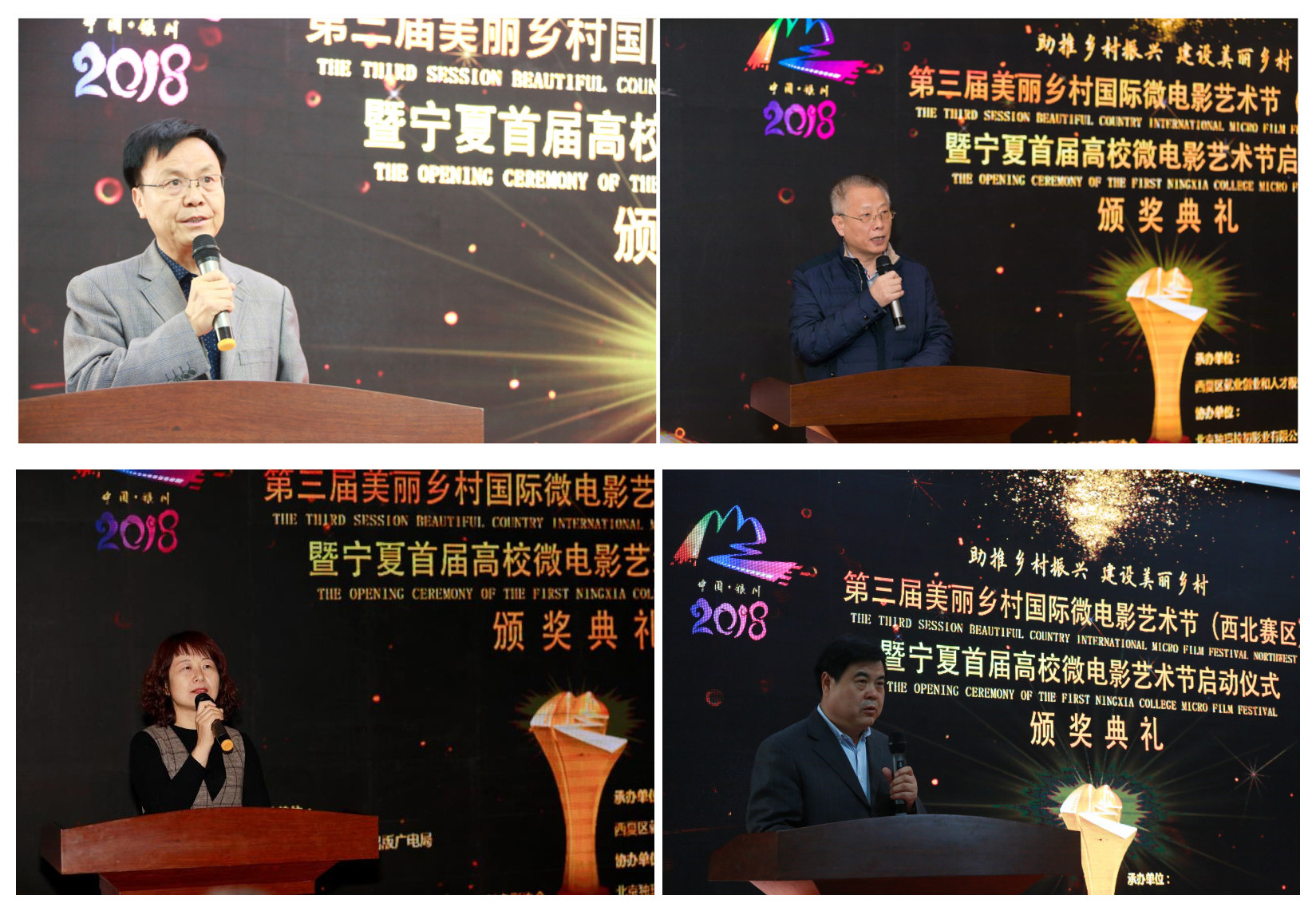 北方民族大學(xué)創(chuàng)新創(chuàng)業(yè)學(xué)院院長王福平首先致歡迎辭歡迎各界人士的到來;隨后,中國農(nóng)業(yè)電影電視協(xié)會(huì)副理事長兼秘書長張杰、銀川市西夏區(qū)委政法委副書記/西夏區(qū)就業(yè)創(chuàng)業(yè)和人才服務(wù)局局長李曉穎、寧夏回族自治區(qū)新聞出版廣電局傳媒機(jī)構(gòu)管理與宣傳處處長/網(wǎng)絡(luò)視聽節(jié)目管理處處長黨建業(yè)分別在本次微電影藝術(shù)節(jié)上進(jìn)行了致辭,各位領(lǐng)導(dǎo)對(duì)2018美麗鄉(xiāng)村國際微電影藝術(shù)節(jié)西北賽區(qū)的隆重舉行表示熱烈祝賀與祝福。