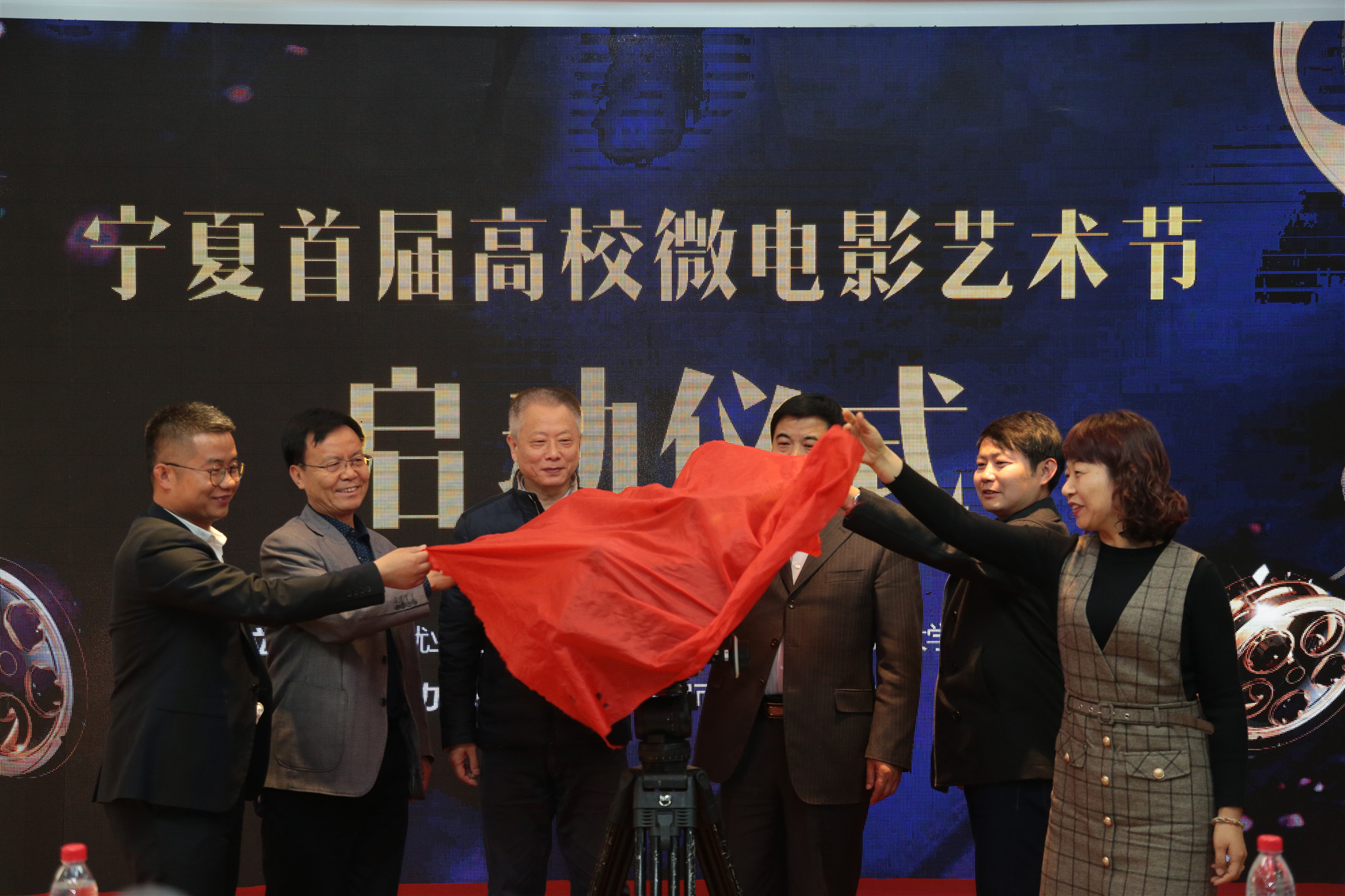 活動(dòng)最后寧夏回族自治區(qū)新聞出版廣電局傳媒機(jī)構(gòu)管理與宣傳處處長、網(wǎng)絡(luò)視聽節(jié)目管理處處長黨建業(yè),中國農(nóng)業(yè)電影電視協(xié)會(huì)副理事長兼秘書長張杰,寧夏回族自治區(qū)新聞出版廣電局電影處吳鵬,銀川市西夏區(qū)委政法委副書記、西夏區(qū)就業(yè)創(chuàng)業(yè)和人才服務(wù)局局長李曉穎,北方民族大學(xué)創(chuàng)新創(chuàng)業(yè)學(xué)院院長王福平,寧夏回族自治區(qū)微電影協(xié)會(huì)會(huì)長魏軍共同為寧夏首屆高校微電影藝術(shù)節(jié)進(jìn)行了啟動(dòng)揭幕。