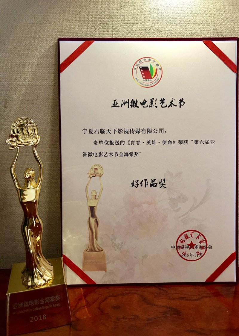 11月7日,第六屆亞洲微電影藝術(shù)節(jié)頒獎(jiǎng)典禮在云南臨滄舉行,由中國(guó)人民解放軍寧夏軍區(qū)出品,寧夏回族自治區(qū)微電影協(xié)會(huì)、寧夏君臨天下影視傳媒有限公司、北京獨(dú)瑪拉初影業(yè)有限公司拍攝的公益征兵影片《青春·英雄·使命》榮獲第六屆亞洲微電影藝術(shù)節(jié)“金海棠”大獎(jiǎng)。